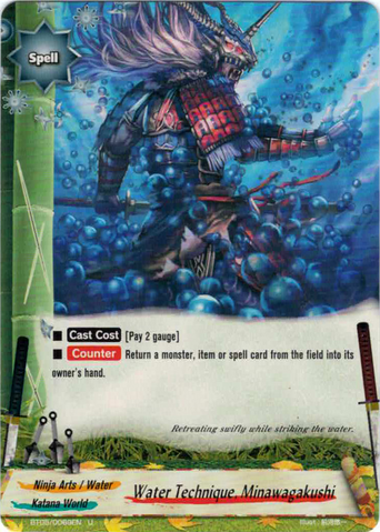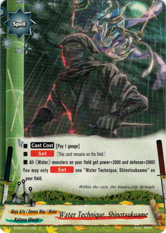 - All 《Water》 monster on your field gets power+2000. You may only [Set] one "Water Technique, Shinotsukuame" on your field.