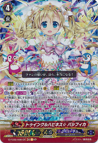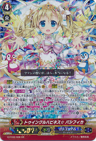 Activate [V] [1/Turn]: [Counter Blast (1) & Choose a face down card named 「Twinkle Happiness☆Pacifica」 from your G zone, and turn it face up] If you have a heart card with 「Pacifica」 in its card name, choose one of your rear-guards, and return it to your hand. If you return a card, search your deck for up to one card with 「Pacifica」 in its card name, reveal it to your opponent, put it into your hand, and shuffle your deck. Then, you may choose up to three cards with 「Pacifica」 in its card name from your hand, and reveal them. If the number of cards you revealed is three, and all the cards revealed are of the same card name, this unit gets [Critical] +1 until end of turn.