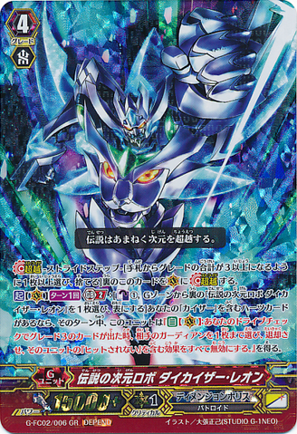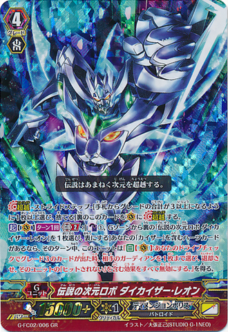 Activate [V] [1/Turn] [Generation Break (2)]: [Counter Blast (1) & Choose a face down card named 「Legendary Dimensional Robo, Daikaiser Leon」 in your G zone, and turn it face up] If you have a heart card with 「Kaiser」 in its card name, until end of turn, this unit gets 「Auto [V]: When your drive check reveals a grade 3 card, choose up to one of your opponent's guardians, retire it, and that unit's effects with 「cannot be hit」 is nullified.」.