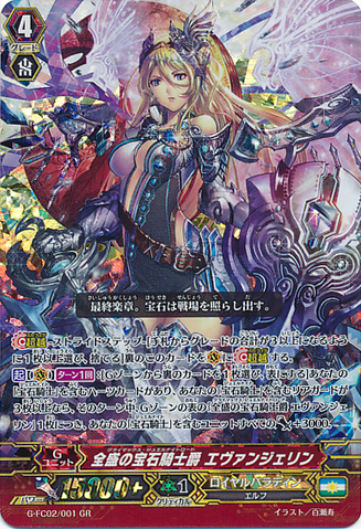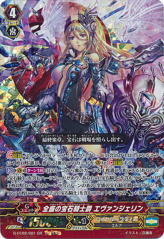 Activate [V] [1/Turn]: [Choose a face down card from your G zone, and turn it face up] If you have a heart card with 「Jewel Knight」 in its card name, and if you have three or more rear-guards with 「Jewel Knight」 in its card name, all of your units with 「Jewel Knight」 in its card name get [Power] +3000 for each face up card named 「Climax Jewel Knight Lord, Evangeline」 in your G zone until end of turn.