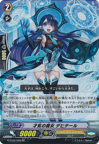 Auto: [(0)] When this unit is placed on [R], if the number of cards with originally 「Witch」 in its card name on your [V] is two or more, you may pay the cost. If you do, choose one of your opponent's [R] with a rear-guard, your opponent reveals the five cards from the top of his or her deck, chooses a grade 0 card from among them, calls it to that [R], and shuffle his or her deck. {A (0) cost is paid by declaring that you are paying it.}