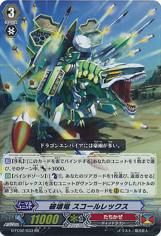 Auto [Bind Zone]: [Counter Blast (1) & Choose one of your rear-guards, and retire it] At the end of the battle that your unit with 「Rex」 attacked a vanguard, you may pay the cost. If you do, call this card to [R].