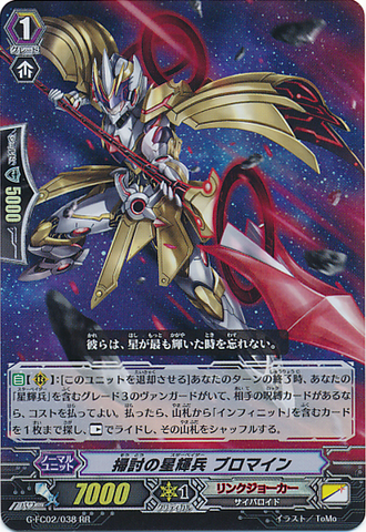 Auto [R]: [Retire this unit] At the end of your turn, if you have a grade 3 vanguard with 「Star-vader」 in its card name, and your opponent has a locked card, you may pay the cost. If you do, search your deck for up to one card with 「Infinite」 in its card name, and ride it as [Rest].
