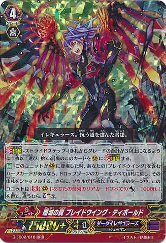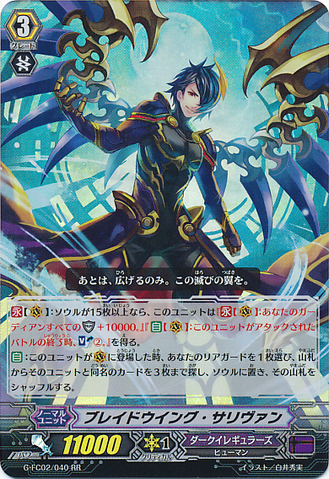 Auto: When this unit is placed on [V], you have a heart card with 「Blade Wing」 in its card name, return all the cards from your drop zone to your deck, and shuffle your deck. Then if the number of cards in your soul is fifteen or more, until end of turn, this unit gets 「Continuous [V]: All of your rear-guards in the front row get [Power] +10000.」, and if not, [Soul Charge (5)].