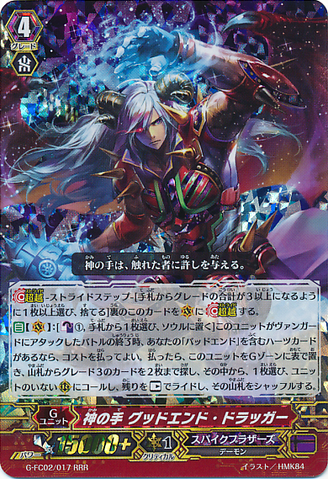 Auto [V]: [Counter Blast (1) & Choose a card from your hand, and put it into your soul] At the end of the battle that this unit attacked a vanguard, if you have a heart card with 「Bad End」 in its card name, you may pay the cost. If you do, put this unit into your G zone face up, search your deck for up to two grade 3 cards, choose a card from among them, call it to an open [R], ride the rest as [Rest], and shuffle your deck.