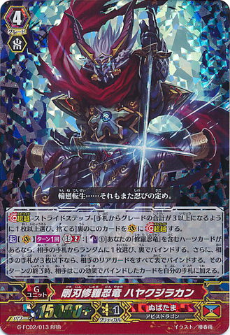 Activate [V] [1/Turn] [Generation Break (2)]: [Counter Blast (1)] If you have a heart card with 「Shura Stealth Dragon」 in its card name, choose a card at random from your opponent's hand, and bind it face down. Then, if the number of cards in your opponent's hand is three or less, bind all your opponent's rear-guards face up. At the end of that turn, your opponent puts the cards bound with this effect into his or her hand.