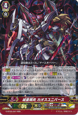 Activate [V] [1/Turn]: [Counter Blast (1) & Choose a face down card named 「Death Star-vader, Chaos Universe」 from your G zone, and turn it face up] If you have a heart card with 「Chaos」 in its card name, choose up to one of your opponent's [R] without a card, your opponent chooses a card of his or her hand, and put it into that [R] face down as a locked card. If the number of face up cards in your G zone is two or more, choose one of your opponent's rear-guards, and lock it.