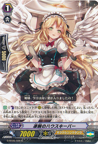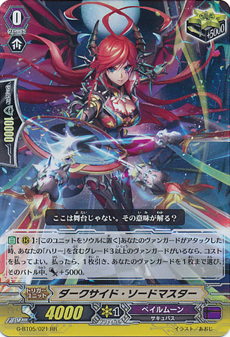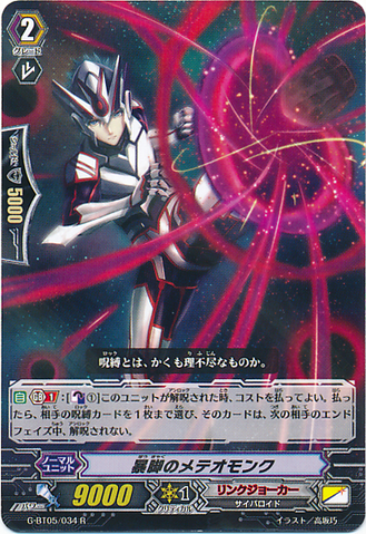 Auto [Generation Break (1)]: [Counter Blast (1) & Soul Blast (1)] When this unit is placed on [R], if you have a grade 3 or greater vanguard with 「Vanquisher」 in its card name, you may pay the cost. If you do, your opponent chooses one of his or her rear-guards, retires it, binds that card face up, and this unit gets [Power] +2000 until end of turn.