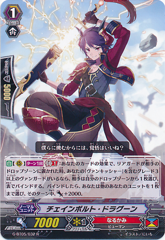 Activate [R] [Generation Break (1)]: [Put this unit into your soul] Your opponent chooses a card from his or her drop zone, binds it face up, you choose up to one of your other units, and until end of turn, it gets 「Continuous [V/R] [Thunderstrike 2] {This ability is active if your opponent has two or more cards in their bind zone}: During your turn, this unit gets [Power] +5000.」.