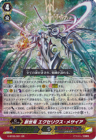 Auto [V]: [Counter Blast (1) & Choose a face card named 「Genesis Dragon, Amnesty Messiah」 from your G zone, and turn it face up] When this unit attacks a vanguard, if you have a face up card named 「Genesis Dragon, Amnesty Messiah」 in your G zone, you may pay the cost. If you do, choose any number of locked cards, unlock them. All of your units unlocked with this effect get [Power] +3000 until end of turn. Retire all of your opponent's units unlocked with this effect. If the number of units unlocked is three or more, this unit gets [Critical] +1 until end of that battle.
