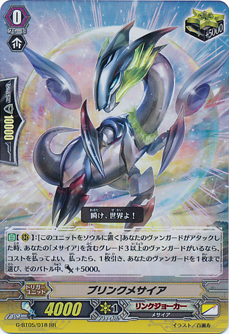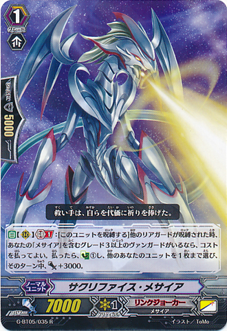 Auto [R]: [Put this unit into your soul] When your vanguard attacks, if you have a grade 3 or greater vanguard with 「Messiah」 in its card name, you may pay the cost. If you do, draw a card, choose one of your vanguards, and it gets [Power] +5000 until end of that battle.