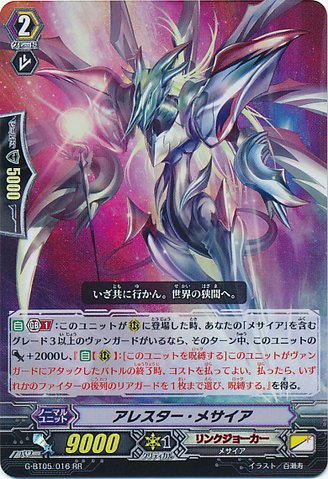 Auto [Generation Break (1)]: When this unit is placed on [R], if you have a grade 3 or greater vanguard with 「Messiah」 in its card name, until end of turn, this unit gets [Power] +2000, and 「Auto [R]: [Lock this unit] At the end of the battle that this unit attacked a vanguard, you may pay the cost. If you do, choose up to one of either player's rear-guards in the back row, and lock it.」.