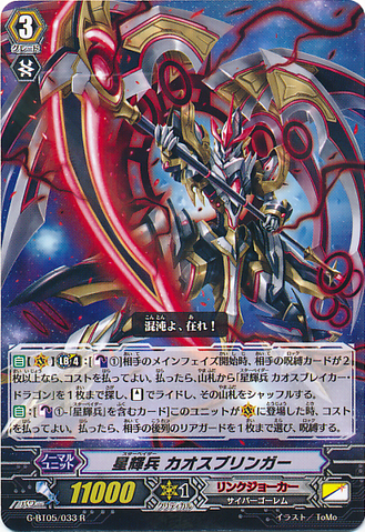 Activate [R]: [Put this unit into your soul] If you have a vanguard with 「Chaos」 in its card name, and your opponent has a locked card, [Counter Charge (2)] and [Soul Charge (2)].