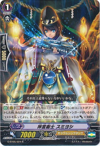 Auto [R]: [Put this unit into your soul] When your vanguard attacks, if you have a grade 3 or greater vanguard with 「Susanoo」 in its card name, you may pay the cost. If you do, draw a card, choose one of your vanguards, and it gets [Power] +5000 until end of that battle.