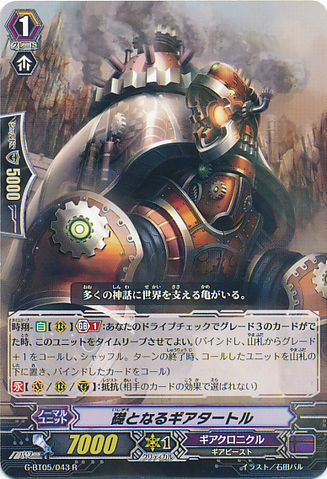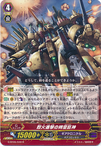 Time Leap - Auto [Generation Break (1)]: When this unit is placed on [R] from hand, choose up to one of your other rear-guards, and Time Leap it. {Bind it, call a card from your deck that is a grade greater, and shuffle. At the end of turn, put the unit called on the bottom of your deck, and call the bound card.}