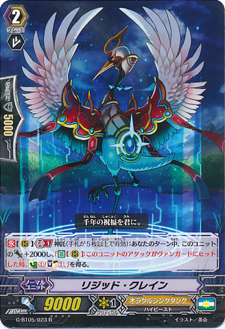 Auto [Generation Break (1)]: [Counter Blast (1)] When this unit is placed on [V] or [R], you may pay the cost. If you do, choose up to one of your opponent's grade 1 or less rear-guards, and your opponent puts that unit on the bottom of his or her deck.