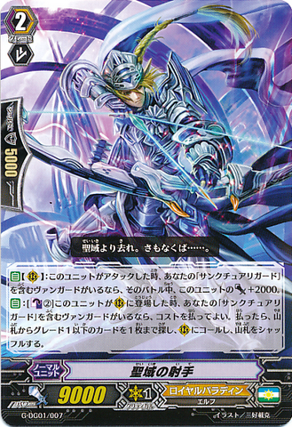 Auto: [Counter Blast (2)] When this unit is placed on [R], if you have a vanguard with 「Sanctuary Guard」 in its card name, you may pay the cost. If you do, search your deck for up to one grade 1 or less card, call it to [R], and shuffle your deck.
