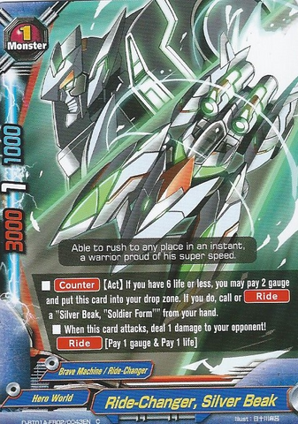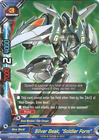 - [Counter] [Activate] If your life is 6 or less, you may pay 2 gauge and put this card on the field into the drop zone. If you do, call or [Ride] "Silver Beak, "Soldier Form"" from your hand.