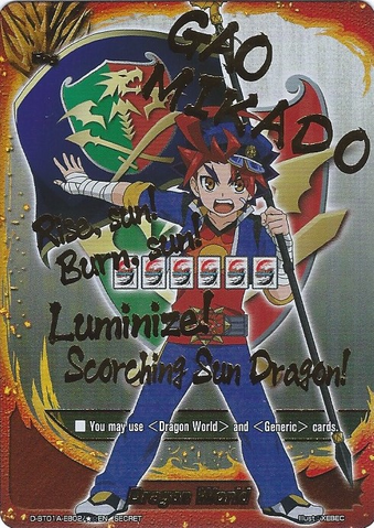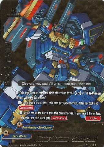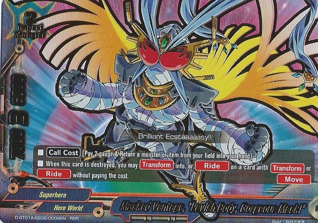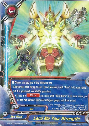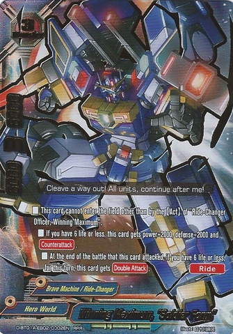 - [Counter] [Activate] If you are [Ride] on "Ultimate Card Burn", you may pay 2 gauge. If you do, put "Ultimate Card Burn" into your drop zone. Then, [Ride] a "Ultimate Card Burn "D-Wing"" from your deck and shuffle your deck.