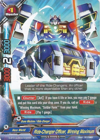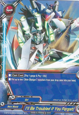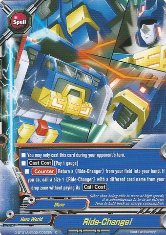- [Counter] Return a 《Ride-Changer》 from your field to your hand. If you do, call a size 1 《Ride-Changer》 from your drop zone with different name than the returned card without paying its [Call Cost].