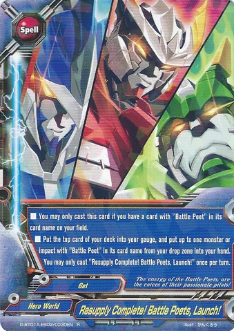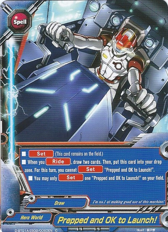 - When you [Ride] into a card, draw two cards. Then, put this card into your drop zone. For this turn, you cannot [Set] "Prepped and OK to Launch!".