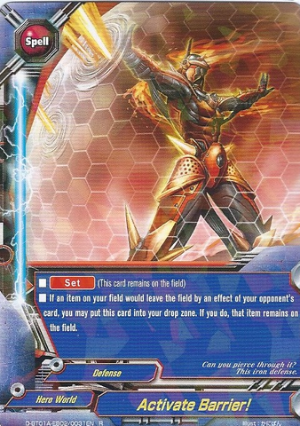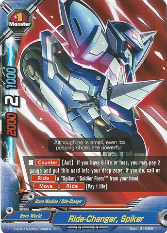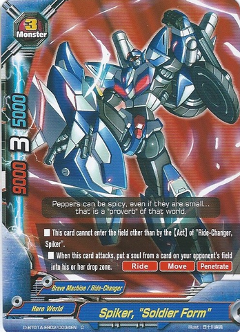 - [Counter] [Activate] If your life is 6 or less, you may pay 2 gauge and put this card on the field into the drop zone. If you do, call or [Ride] " Spiker, "Soldier Form"" from your hand.