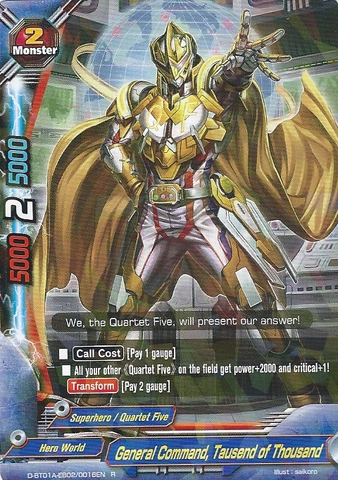 - [Counter] [Activate] If an opponent's card is attacking alone, and you have another 《Quartet Five》 on your field, you may pay 2 gauge. If you do, nullify the attack.