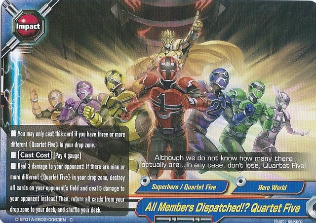 - Deal 3 damage to your opponent! If there are 9 or more different 《Quartet Five》 in your drop zone, destroy all cards on your opponent's field and deal 5 damage to your opponent instead!