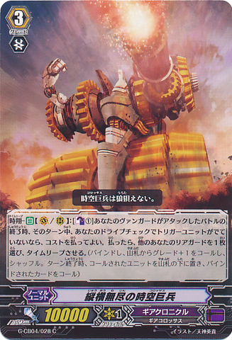 Auto [R] [Generation Break (1)]: [Retire this unit] At the end of the battle that this unit boosted a vanguard with 「Chronoscommand」 in its card name, if you do not have any face up cards in your damage zone, you may pay the cost. If you do, [Counter Charge (2)]. Then, if the number of cards in your hand is five or less, draw a card.