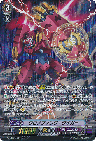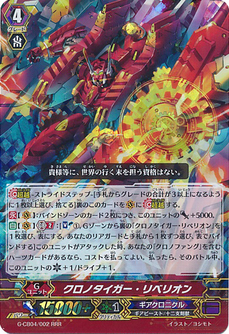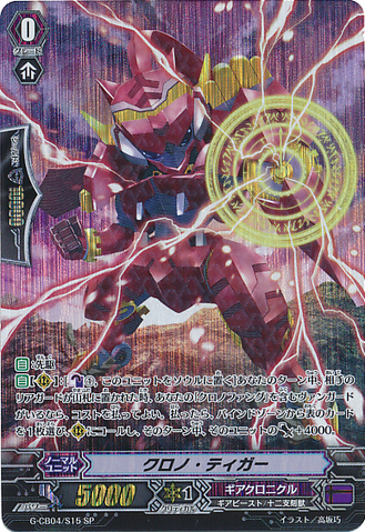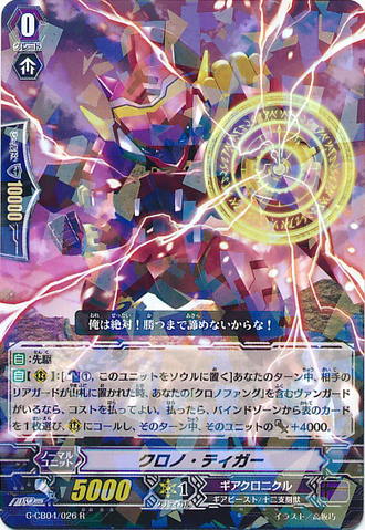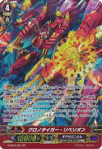 Auto [V] [Generation Break (2)]: [Soul Blast (1) & Choose a face down card named 「Chronotiger Rebellion」 from your G zone, and turn it face up & Choose a card from your hand and rear-guards, and bind them face up] When this unit attacks, if you have a heart card with 「Chronofang」 in its card name, you may pay the cost. If you do, this unit gets [Critical] +1 / drive +1 until end of that battle.