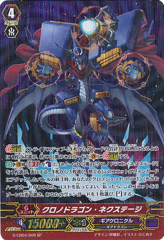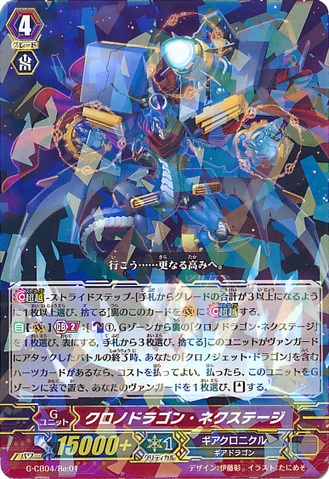 Auto [V] [Generation Break (2)]: [Counter Blast (1) & Choose a face down card named 「Chronodragon Nextage」 from your G zone, turn it face up, choose three cards from your hand, and discard them] At the end of the battle that this unit attacked a vanguard, if you have a heart card with 「Chronojet Dragon」 in its card name, you may pay the cost. If you do, put this unit into your G zone face up, choose one of your vanguards, and [Stand] it.