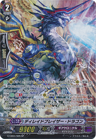 Auto [Bind Zone] [Generation Break (1)]: [Soul Blast (1)] At the end of the battle that your grade 4 vanguard with 「Chronofang」 in its card name attacked a vanguard, you may pay the cost. If you do, call this card to [R].