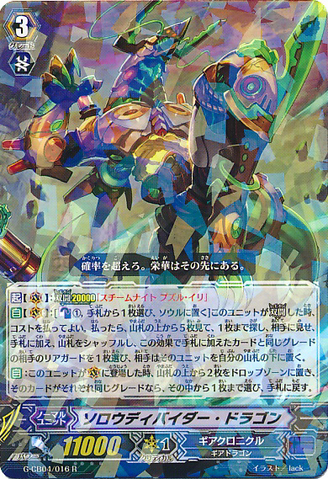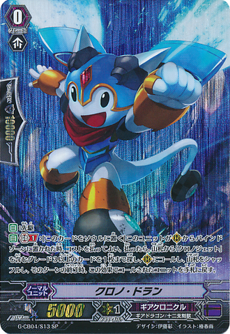 Auto: [Put this unit into your soul] When this unit is put into your bind zone from [R], if you have a grade 3 or greater vanguard with 「Chronofang」 in its card name, you may pay the cost. If you do, draw a card, choose one of your vanguards, and it gets [Power] +5000 until end of that battle.