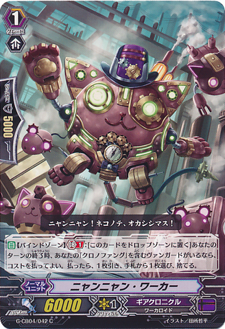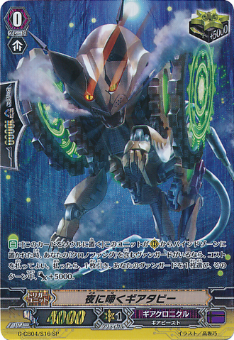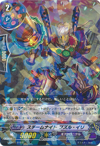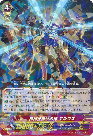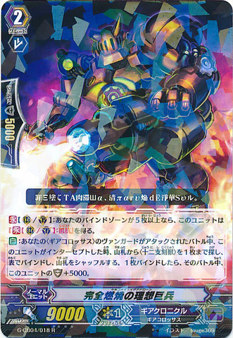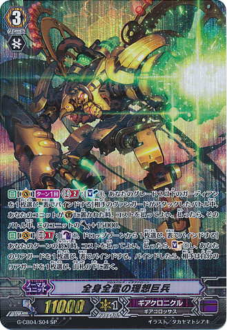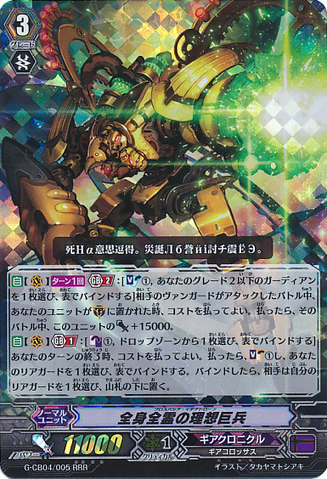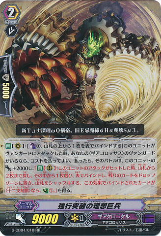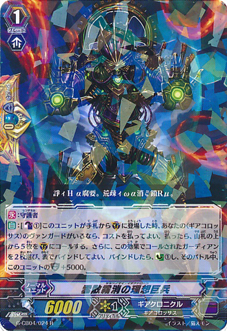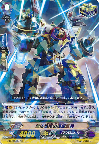 Auto [R]: [Counter Blast (1) Bind the top card of your deck face up] When this unit attacks a vanguard, if you have a <Gear Colossus> vanguard, you may pay the cost. If you do, until end of that battle, this unit gets [Power] +2000, and 「Auto [R]: When this unit's attack hits a vanguard, search your deck for up to two cards, choose a card from among them, bind it face up, put the rest into your drop zone, and shuffle your deck. If the card bound with this effect is <Zodiac Time Beast>, [Counter Charge (1)].」.