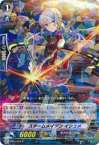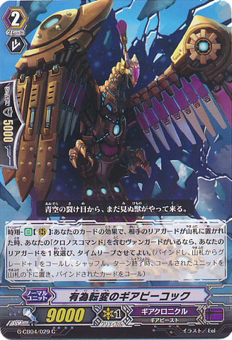Continuous [R] [Generation Break (1)]: If you have a vanguard with 「Chronoscommand」 in its card name, and the number of your opponent's rear-guards is one or less, this unit gets [Power] +5000, and this unit can attack a vanguard from the back row.