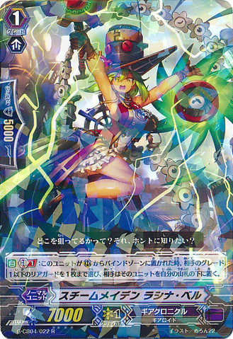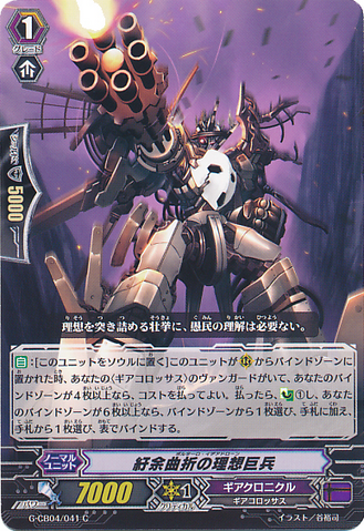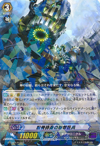 Auto: [Put this unit into your soul] When this unit is put into your bind zone from [R], if you have a <Gear Colossus> vanguard, and the number of cards in your bind zone is four or more, you may pay the cost. If you do, [Counter Charge (1)] and if the number of cards in your bind zone is six or more, choose a card from your bind zone, put it into your hand, choose a card from your hand, and bind it face up.