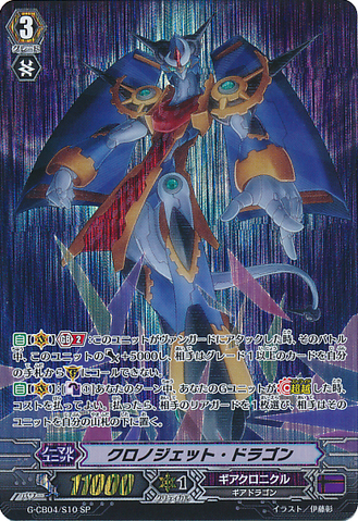 Auto [Generation Break (1)]: When this unit is placed on [R], if you have a vanguard with 「Chronojet」 in its card name, choose one of your units, and until end of turn, it gets [Power] +2000, and 「Time Leap - Auto [V/R]: When this unit's attack hits a vanguard, choose one of your other rear-guards, and you may time leap it.」.