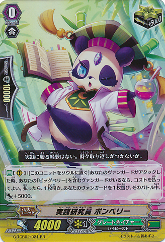 Auto [R] [1/Turn] [Generation Break (1)]: [Soul Blast (1)] When this unit is successful and attacks a vanguard, if you have a vanguard with 「Bigbelly」 in its card name, you may pay the cost. If you do, choose up to two of your other rear-guards, until end of turn, they get [Power] +4000, and 「Auto [R]: At the end of your turn, draw a card, and retire this unit.」.
