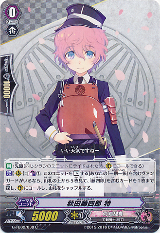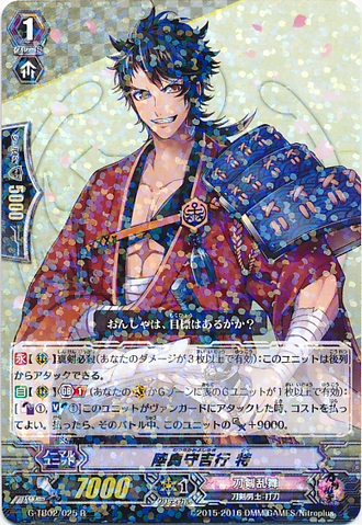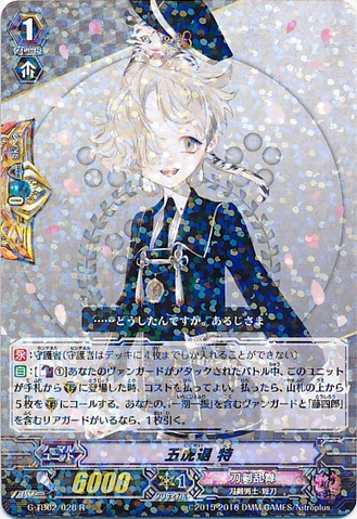 Auto: [Counter Blast (1)] When this unit is placed on [G] from hand during the battle that your vanguard was attacked, you may pay the cost. If you do, call five cards from the top of your deck to [G]. If you have a vanguard with 「Ichigo Hitofuri」 in its card name and a rear-guard with 「Toushirou」 in its card name, draw a card.