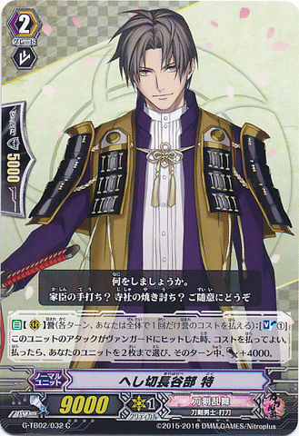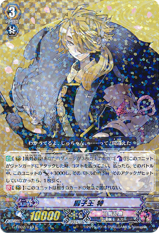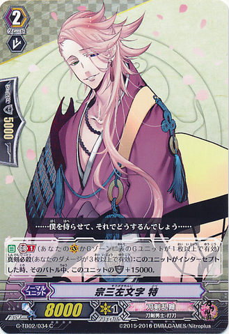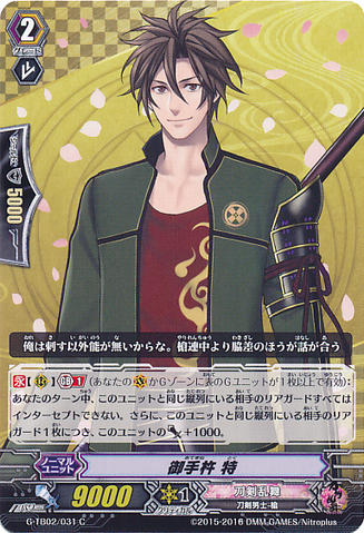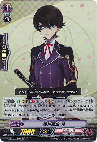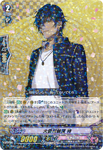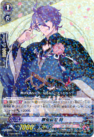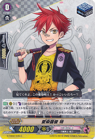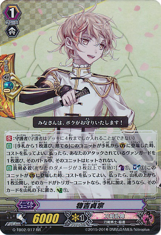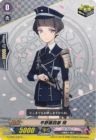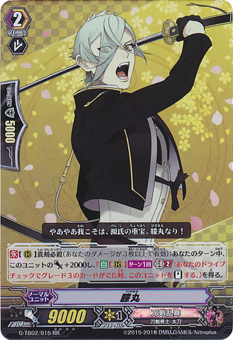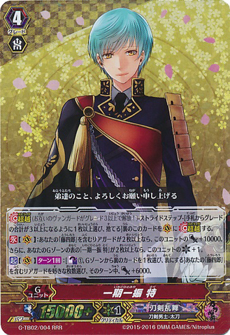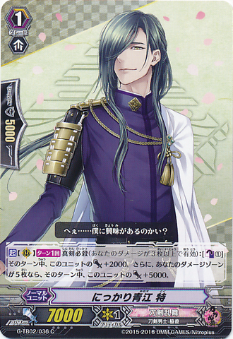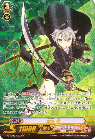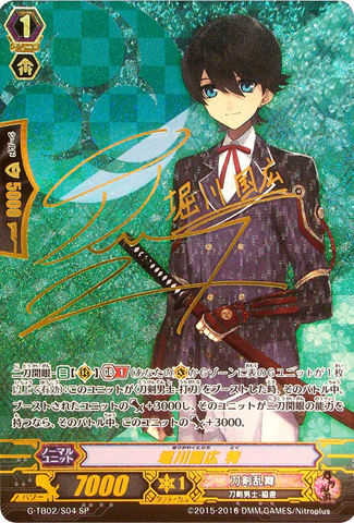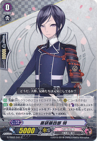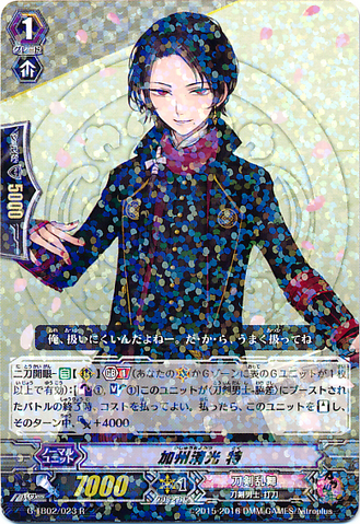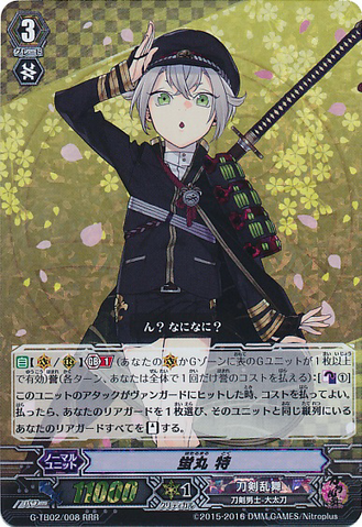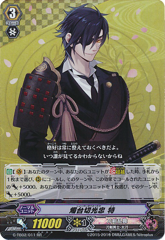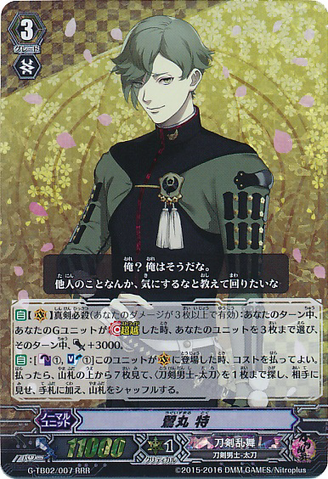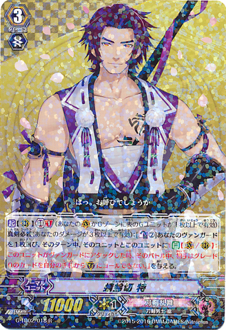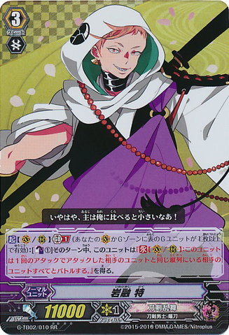 Nitou Kaigan - Auto [R] [Generation Break (1)] {This ability is active if you have one or more face up G units in total on your [V] or G zone}: When this unit boosts a <Touken Danshi - Uchigatana>, the boosted unit gets [Power] +3000 until end of that battle, and if that unit has the Nitou Kaigan ability, this unit gets [Power] +3000 until end of that battle.