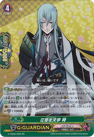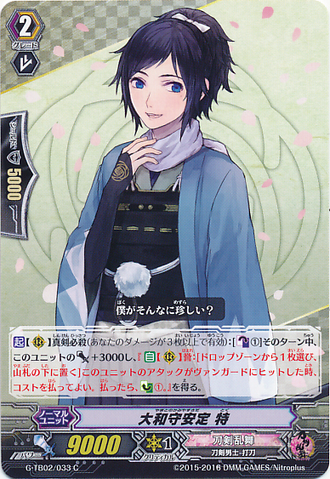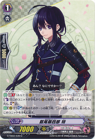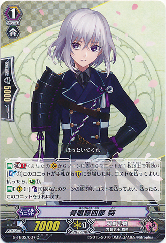 Nitou Kaigan - Auto [R] [Generation Break (1)] {This ability is active if you have one or more face up G units in total on your [V] or G zone}: [Counter Blast (1) & Soul Blast (1)] At the end of the battle that this unit boosted a <Touken Danshi - Wakizashi>, you may pay the cost. If you do, [Stand] this unit, and it gets [Power] +4000 until end of turn.