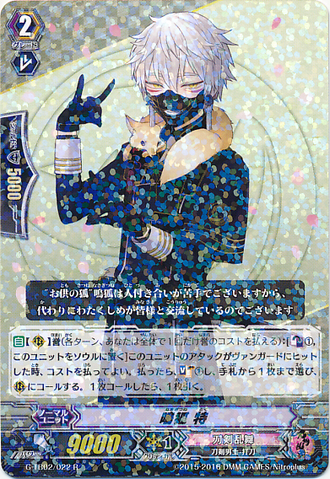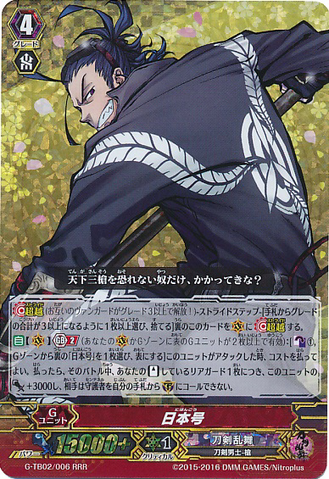 Auto [V] [Generation Break (2)] {This ability is active if you have two or more face up G units in total on your [V] or G zone}: [Counter Blast (1) & Choose a face down card named 「Nihongou」 from your G zone, and turn it face up] When this unit attacks, you may pay the cost. If you do, until end of that battle, this unit gets [Power] +3000 for each of your rear-guards in [Stand], and your opponent cannot call cards with the sentinel ability from hand to [G].