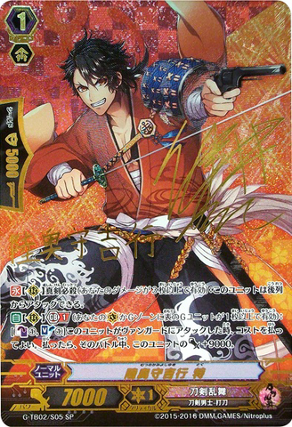 Activate [R]: [Counter Blast (1) & [Rest] this unit] If you have a vanguard with 「Ichigo Hitofuri」 in its card name, look at five cards from the top of your deck, search for up to one card with 「Toushirou」 in its card name from among them, call it to [R], and shuffle your deck.