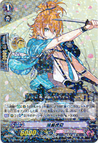Activate [V] [1/Turn]: [Counter Blast (1) & Choose a face down card from your G zone, and turn it face up] Choose any number of your rear-guards with 「Toushirou」 in its card name, and they [Power] +6000 until end of turn.