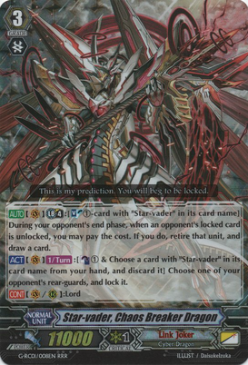 Activate [V] [1/Turn]:[Counter Blast (1) & Choose a card with 「Star-vader」 in its card name from your hand, and discard it] Choose one of your opponent's rear-guards, and lock it.