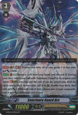 Auto [V]: [Choose a card from your hand, and discard it] During your turn, when your G unit with 「Sanctuary Guard」 in its original card name 「Stride」 , you may pay the cost. If you do, search your deck for up to one grade 1 or less card, call it to [R], shuffle your deck, choose one of your vanguards, that unit and the unit called with this effect get [Power] +3000 until end of turn.RR