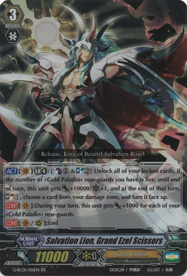 Continuous [V]: During your turn, this unit gets [Power] +1000 for each of your 《Gold Paladin》 rear-guards.