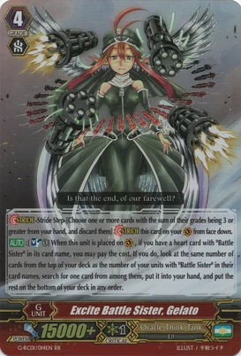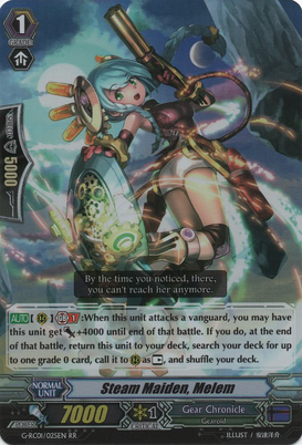 Normal/1/Boost/7000/5000/1Auto [R] [Generation Break (1)]: When this unit attacks a vanguard, you may have this unit get [Power] +4000 until end of that battle. If you do, at the end of that battle, return this unit to your deck, search your deck for up to one grade 0 card, call it to [R] as [Rest], and shuffle your deck.