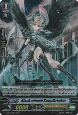 Auto: [Soul Blast (1)] When this unit is placed on [R] from your deck, if you have a 《Shadow Paladin》 vanguard, you may pay the cost. If you do, draw a card.