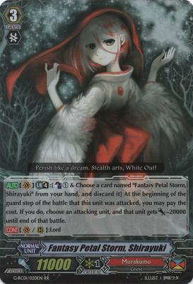 Auto [V] [Limit Break (4)]: [Counter Blast (1) & Choose a card named 「Fantasy Petal Storm, Shirayuki」 from your hand, and discard it] At the beginning of the guard step of the battle that this unit was attacked, you may pay the cost. If you do, choose an attacking unit, and that unit gets [Power] -20000 until end of that battle.
